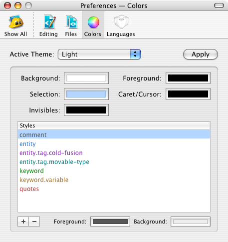 A theme packages all of the color settings into a single file. See the Customizing Themes section for more information about the file format. To change the theme, use the "Active Theme" popup button. Add/rename/remove themes using the "Edit Themes&" item from that button.