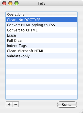 If you need to run your Tidy operation on multiple files, or you would like to combine multiple Tidy operations, you can use the Tidy Panel available from the HTML menu. You can also add/edit/remove operations from the panel.