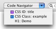 The Code Navigator is a toolbar item that allows you to quickly jump to sections of your code. If the item is not in your toolbar, you can add it by customizing the toolbar via the "View" menu. The Code Navigator searches for regular expressions in your code, and presents them in a menu. You can customize the regular expressions for a specific language in the Languages pref pane.