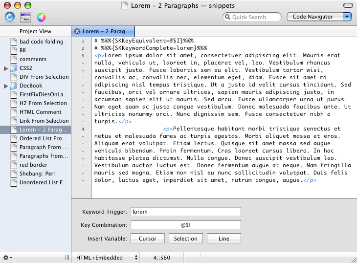 The key combination and keyword trigger are stored as comments at the top of the Snippet file as follows: