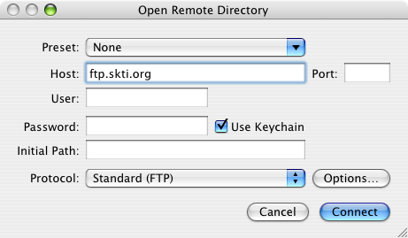 The files for a remote project reside on a server and are accessed via FTP, SFTP, or WebDAV. File operations are sent to the server to be performed. Selecting a file from the project view will cause the file to be downloaded to a local cache so that it can be edited. By default, saving changes to a file will cause the file to be uploaded. You can change this behavior in the project settings. skEdit may prompt you for your username and password if/when needed. At any time, you can explicitly upload/download a file using the items in the Project menu or the contextual menu for the Project View.