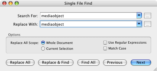 The Single File Find window can be brought up from the "Single File Find&" item in the Edit menu. With it, you can run find & replace operations on the current file. Once a search is active, you can close the window and use the "Find Next", "Find Previous", and "Replace & Find" items from the Edit menu to move through matches in the file.