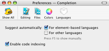 General code-completion settings can be edited in the "Completion" pref pane, as described below. Language-specific code-completion settings are edited in the "Languages" pref pane.