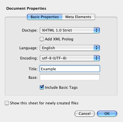 skEdit includes an editor for HTML document properties, such as the DOCTYPE, encoding, etc. This is particularly useful for creating new HTML files, but can also be used to edit existing files. The editor is accessible from the HTML menu, the "Modify Document Properties&" item.