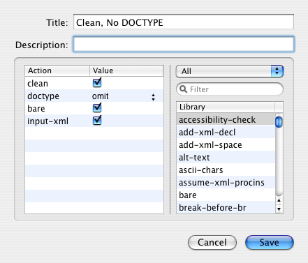 Tidy operations are made up of one or more actions, which define how Tidy will modify the file. A description of all of the actions can be found in the HTML Tidy documentation. To add an action, you can either drag it from the Library into the action list, or double-click it in the Library. Once added, you can change the value of the action as desired. To remove an action, select it in the Action List and hit the Delete key.